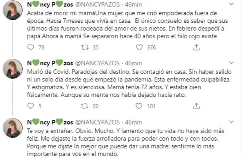"Murió de Covid. Paradojas del destino. Se contagió en casa. Sin haber salido ni un solo día desde que empezó la pandemia. Esta enfermedad culpabiliza. Y estigmatiza. Y es silenciosa. Mamá tenía 72 años. Y estaba bien físicamente, aunque su mente nos había dejado hacía rato", agregó en otro mensaje publicado en su red social.