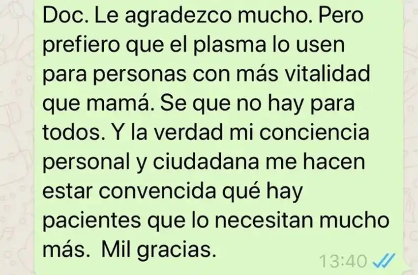 En tanto, mostró el mensaje de WhatsApp que le envió al médico de su progenitora informándole la noticia: "Doc. le agradezco mucho pero prefiero que el plasma lo usen para personas con más vitalidad que mamá. Sé que no hay para todos y la verdad, mi consciencia personal y ciudadana me hacen estar convencida que hay pacientes que lo necesitan mucho más. Mil gracias".