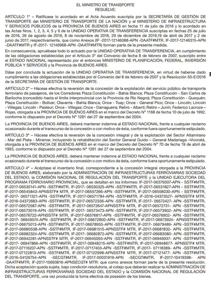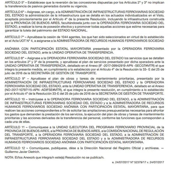 A través de la Resolución 517-E/2017, publicada en las últimas horas en el Boletín Oficial, el Ministerio de Transporte de la Nación ordenó realizar las acciones pertinentes "a fin de solicitar las ampliaciones presupuestarias necesarias para afrontar los gastos que demanden la prestación de los servicios, la ejecución del plan de obras y tareas de mantenimiento prioritarias y las acciones derivadas de la transferencia del personal, conforme las funciones que corresponden a cada una de ellas".