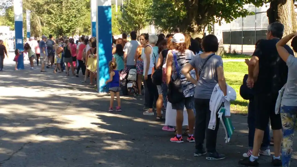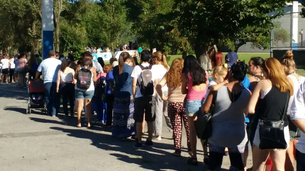 Cientos de personas forman desde muy temprano una larga cola de más de tres cuadras en las inmediaciones del Polideportivo Municipal Islas Malvinas a la espera de poder retirar a partir de las 10 su pase gratuito para disfrutar de alguna de las obras que se ofrecen en el marco de la nueva edición de la "Noche de los Teatros y la Recreación".