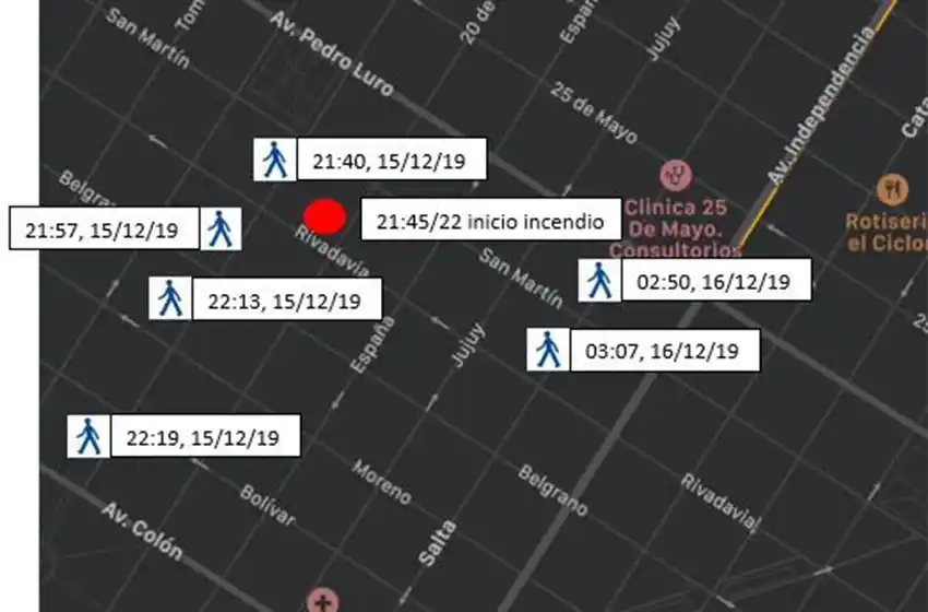 bomberos y coincide con el horario donde se constata la presencia del imputado en la zona del hecho. Asimismo, destacaron que un testigo declaró que entre las 21:30 y las 21:45 de ese domingo, a la altura del lugar donde se produjo el inicio del siniestro, vio a una persona deambular entre la calle y la vereda, El mismo tenía "bultos y algo que podría ser una especie de carro", consistente con las características del imputado.