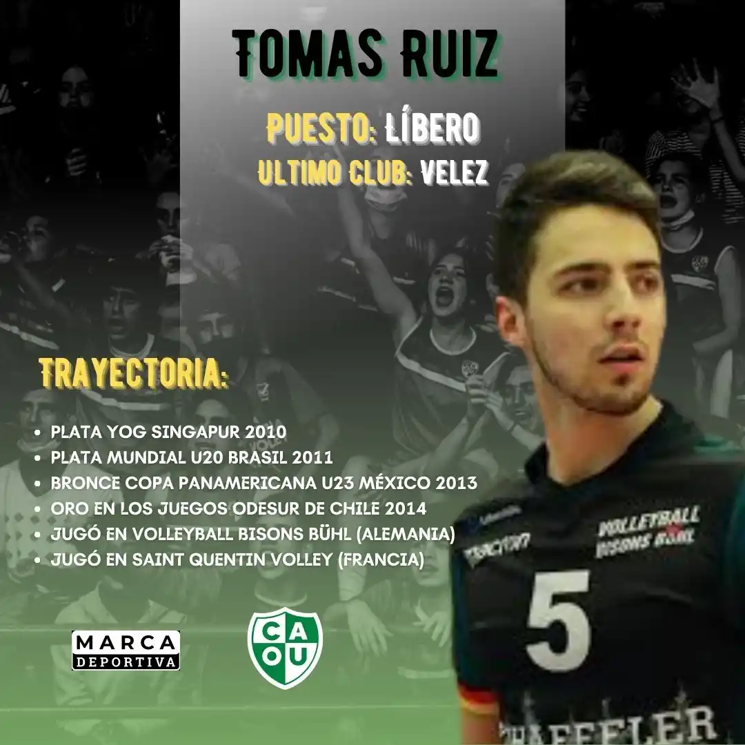 Entre los más experimentados, está el líbero Tomás Ruiz de 30 años. El nacido en Capital Federal y de último paso por Velez Sarsfield, tiene una larga trayectoria que incluye participación en las Selecciones Argentina de Base y Juvenil con una medalla de plata en los Juegos Olímpicos de la Juventud de Singapur 2010 y en el Mundial U20 de Brasil 2011. Además, sumó un bronce en la Copa Panamericana U23 de México 2013 donde fue elegido como el mejor líbero y el oro en los ODESUR de Chile 2014.