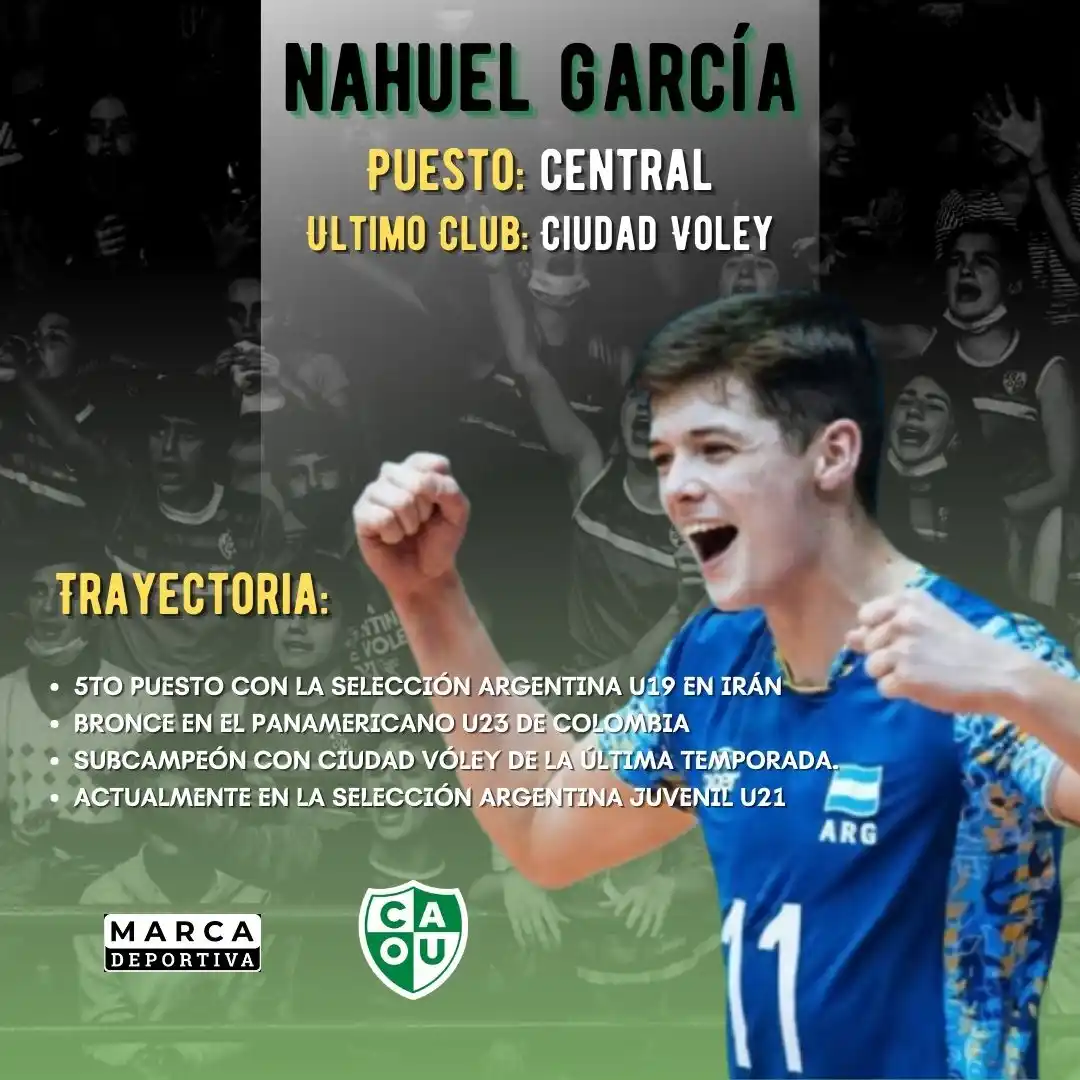 A ellos se le sumarán dos jugadores más con mucho potencial y buen presente. Uno de ellos, con sólo 18 años, es Nahuel García un central proveniente de Ciudad Voley y nacido en Belgrano, provincia de Buenos Aires. Ha formado parte de la Selección Argentina U19 que logró un 5° puesto el Mundial de Irán, fue medalla de bronce con la Selección Argentina U23 en el Panamericano que se disputó en Colombia junto a Bautista Gazaba y el propio Zelayeta; fue subcampeón con Ciudad Voley en la última temporada. Incluso fue dirigido por Gonzalo Borstelmann y compañero de Juan Ignacio Macció en el Campeonato Argentino de Selecciones provinciales representando a Buenos Aires. En la actualidad, forma parte de la lista de jugadores citados para disputar el Sudamericano U21 con la Selección Argentina.