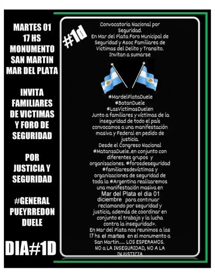 Este martes, Asociaciones civiles, organizaciones, ONG, fomentistas, familiares de víctimas del delito y sectores de trabajadores serán parte de un reclamo al pie del monumento al Gral. San Martín en avenida Luro y Mitre.