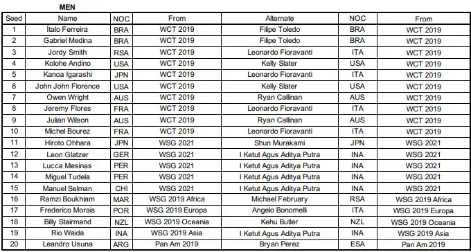 El camino hacia Tokio para el estreno del surf en los Juegos Olímpicos se ha completado con Leandro Usuna como único clasificado argentino. Ya están los 20 nombres tanto en damas como en caballeros que tienen asegurada su plaza en el certamen. Sin embargo, la International Surfing Association (ISA) confirmó un suplente para cada deportista clasificado en las distintas instancias.
