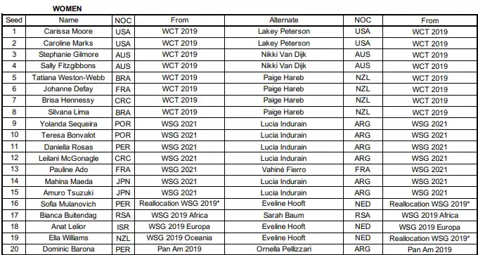 La Internacional Surfing Association (ISA) oficializó los surfistas alternativos para los Juegos Olímpicos de Tokio 2020 de acuerdo a la instancia de clasificación que hayan disputado. Ornella Pellizzari será reemplazo por los Panamericanos de Lima. Además, Lucía Indurain es sustituta para 6 surfistas clasificadas en el Mundial de El Salvador.
