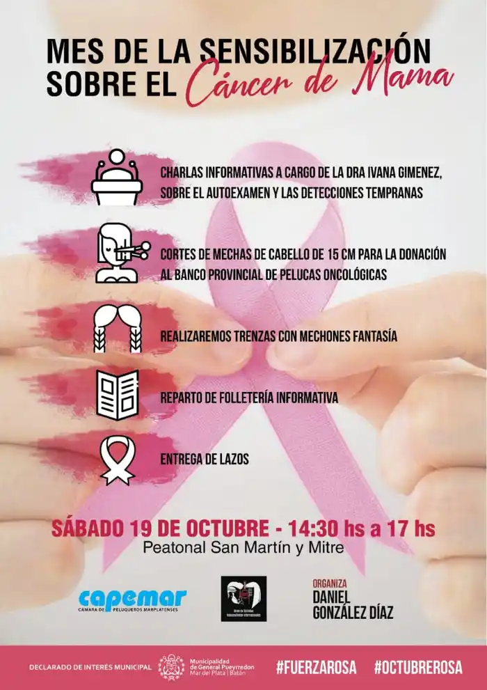 En el encuentro, Declarado de Interés Municipal, también se llevará a cabo la entrega del tradicional lazo rosa pero sobre todo mujeres, niños y niñas podrán sumar un mechón rosa a su pelo como símbolo de la lucha, de la mano de los profesionales de la UDEII. Además, se realizarán charlas a cargo de la Dra. Ivana Giménez (MN 95742) y la Cámara de Peluqueros Marplatenses estará a cargo del corte de mechones de cabello que luego serán donados al Banco Provincial de Pelucas Oncológicas.