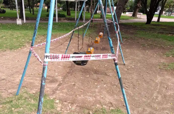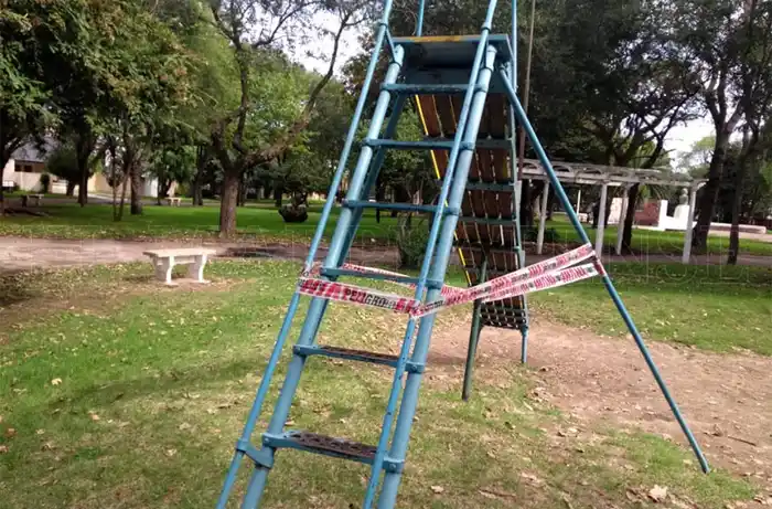 Así está la plaza Justo José de Urquiza, ubicada en el barrio Estrada. Toboganes, sube y baja, y hamacas permanecen encintadas a la espera de que pase la pandemia. Una medida de seguridad extra en caso de algún irresponsable que salga de su vivienda.