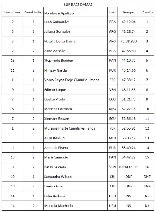 Guimaraes cerró con un tiempo de 41:12, Gonzales con 42.28. En tercer lugar y ganadora de la Medalla de Bronce quedó Natalia de la Lama también de Argentina con 42:38 y la cuarta posición y Medalla de Cobre fue para Aline Adisaka con un tiempo de 42:55.