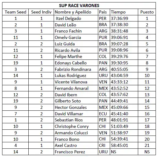 Las Carreras SUP tanto para hombres como para mujeres entregaron las primeras Medallas de Oro del evento, ganadas por Itzel Delgado de Perú y Lena Guimaraes de Brasil. Delgado cerró la carrera con un tiempo de 37 minutos con 36 segundos, mientras que Leao detuvo el cronometro en 37 minutos con 38 segundos. En tercero quedó Franco Fachin de Argentina con un tiempo de 38:31 y cuarto quedó Omelv García de Puerto Rico con 39:06.