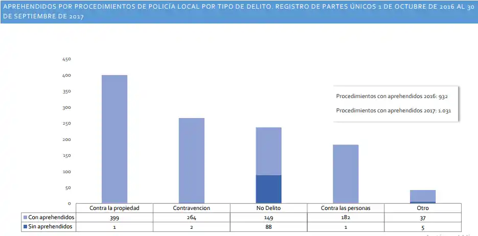 Durante su segundo año de servicio, la Policía Local realizó 1.128 procedimientos, superando el registro del año previo que arrojaba 778 intervenciones registradas por partes únicos. El 75% fue por delitos o contravenciones flagrantes (prevenibles y no prevenibles), el resto fue clasificado por el CeMAED como originado en “no delitos”, ya que la actuación no fue iniciada por un delito que se estuviera cometiendo en el momento de la intervención.