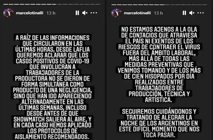 "A raíz de las informaciones que circularon en las últimas horas, desde LaFlia queremos aclarar que los casos positivos de COVID-19 que involucran a trabajadores de la productora no se dieron de forma simultánea como producto de una negligencia", comienza el descargo de LaFlia que compartió Tinelli desde su cuenta de Twitter.