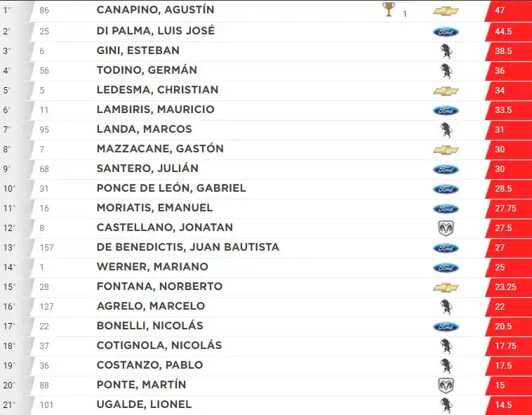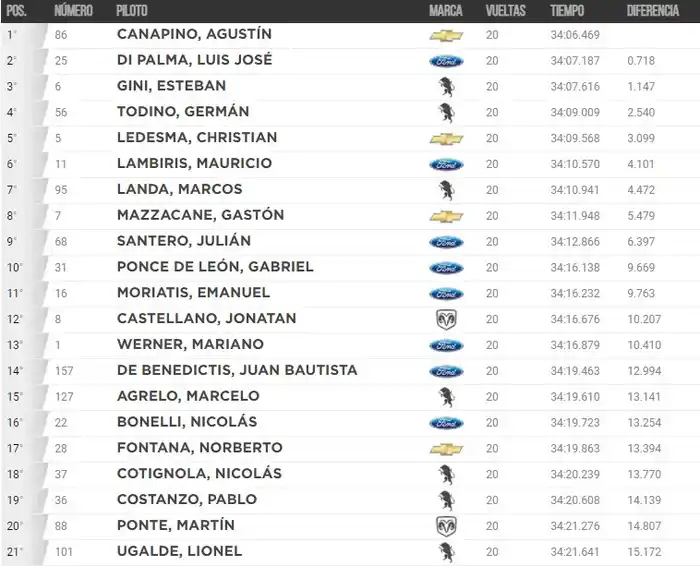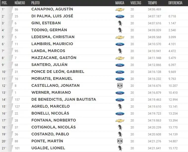 Fue todo para Canapino que en el recuerdo de su padre, se quedó con el triunfo para brindarle el mejor homenaje posible y además, lograr la segunda victoria consecutiva. Un fin de semana difícil y complicado desde lo emotivo para muchos protagonistas de la categoría, incluido el propio Ledesma que pudo lograr un muy buen resultado en el inicio de la temporada. Ugalde, en su regreso a la categoría, pudo mantenerse en pista, aprovechar los abandonos para cruzar la meta en el puesto 21.