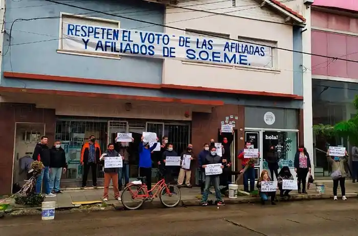 Delegados y afiliados del Sindicato de Obreros y Empleados de la Educación y la Minoridad (SOEME) se manifestaron en la sede gremial para evitar la intervención y que la conducción siga en manos de la lista Azul y Blanca, elegida en diciembre pasado.