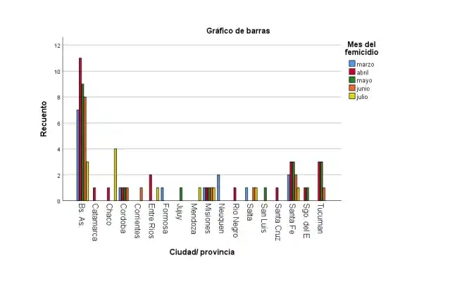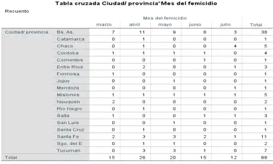 "En cuarentena tomando el período comprendido entre el 12 de Marzo y el 19 de julio del corriente contabilizamos 88 femicidios. También analizamos la tasa de femicidios por provincia ubicándose Tucumán con la mayor cantidad en relación a sus habitantes, seguida de Chaco y Misiones", especificaron desde la organización.