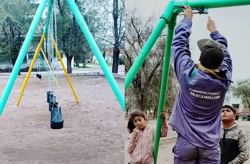 Personas nucleadas en el Programa Nacional de Inclusión Socioproductiva y Desarrollo Local Potenciar Trabajo, junto a la organización Descamisados, se acercaron a la plaza de barrio Belgrano y repusieron las hamacas que habían vandalizadas a menos de diez días de su reparación.
