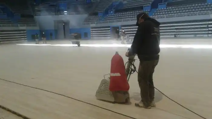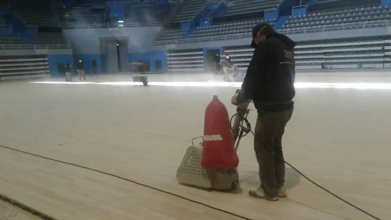 Una vez retirado el piso existente, y con la madera de guatambú proveniente de Misiones, se realizó la estructura o base. Ahora, ya colocado, se está procediendo a los distintos pulidos de la superficie. Finalizada esta etapa, queda el pintado de demarcaciones reglamentarias, pintado de la cubierta, plastificado y colocación de la rejilla.