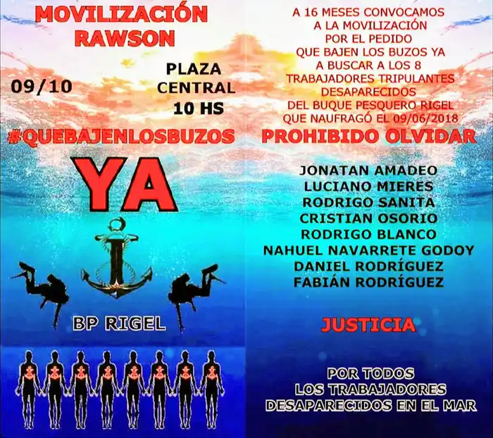 A más de un año del trágico hundimiento, los familiares de los tripulantes del Rigel se movilizarán hoy en Rawson, Chubut, con motivo de cumplirse 16 meses del hecho, dando así continuidad, al reclamo de colaboración, para que buzos bajen a rescatar los cuerpos de los marineros.