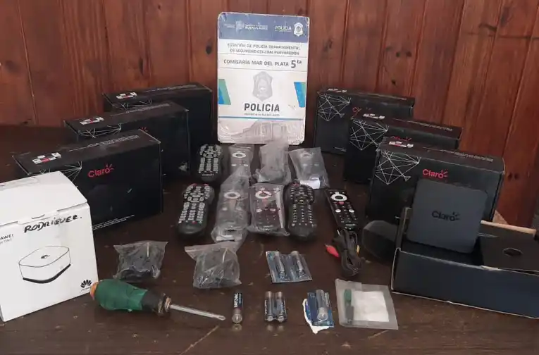 A escasos metros del lugar, los uniformados realizaron la aprehensión de un sujeto de 23 años y de un menor de 16, los cuales tenían en su poder una caja con 7 decodificadores de señal TV, 9 controles remotos, amplificador de wifi, pilas y elementos de anclaje.
