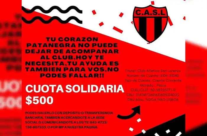 "Estamos sin salida", señalaron. "Hemos presentado todos los requisitos que nos pidió el estado para los programas de ayuda pero no avanzó nada. Estamos perfectos en todo sentido para recibir ayuda ya que contamos con los balances y la situación en Jurídicas es ideal pero no vimos un centavo. Apelamos a la ayuda a la colaboración de los que saben qué es San Lorenzo, cuánto ha hecho por el crecimiento de muchos jóvenes, porque estamos fundidos", explicaron.
