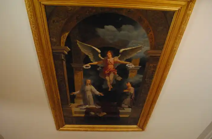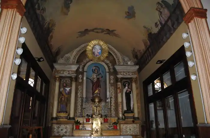 La capilla, además, está cubierta por un techo de tejas francesas. Tiene una única nave con un altar mayor, un presbiterio y los oratorios laterales. Su fachada principal, según detallan especialistas, exhibe líneas neoclásicas y muestra elementos genuinos de esa estética, como capiteles, y un frontis con una cruz de piedra, que tiene en sus extremos dos arcángeles sobre pedestales. La construcción, con una capacidad para albergar a 400 personas según lo que aseguraba el fundador, se completa finalmente con una torre campanario de cúpula nervada.