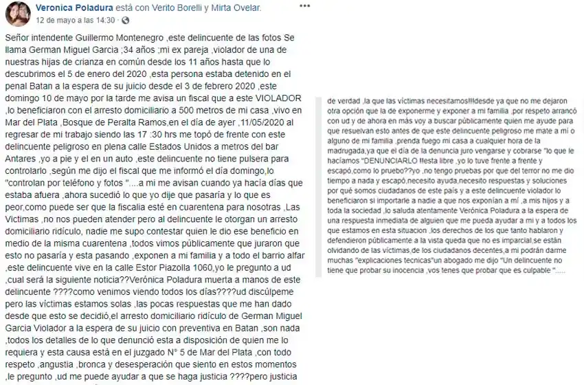 Según Verónica, se volvió a sentir tranquila cuando le dijeron que él "no entraba dentro de los posibles beneficiados". Pero el 10 de mayo, "el fiscal Sergio Irigoin me llamó y me dijo que estaba con prisión domiciliaria", recordó.