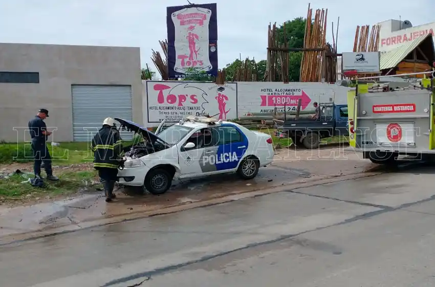 Los afectivos policiales a bordo del patrullero de la Policía Local llamaron rápidamente a los Bomberos que llegaron rápidamente para sofocar el desperfecto en la zona del motor de la unidad.