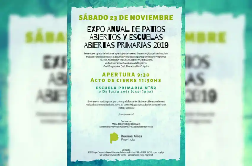 Este sábado 23 de noviembre en se llevará a cabo la Expo Anual de Patios Abiertos y Escuelas Abiertas Primarias 2019, en la sede de la Escuela Primaria N° 62, ubicada en 9 de Julio 4961 (casi Jara), desde las 9.30, con el objetivo de que participen tanto chicos, como adultos, de los distintos talleres que se han realizado a lo largo de todo el año.