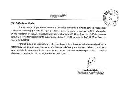 De acuerdo a la documentación oficial, a la que tuvo acceso este medio en forma exclusiva, el boleto debería subir a $91,87. El informe está rubricado por el subsecretario de Movilidad Urbana del municipio, Dante Galván.