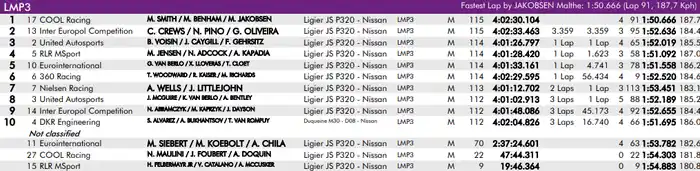 La victoria en la categoría LMP3 fue para el Ligier No17 Cool Racing de Maurice Smith, Michael Benham y Malthe Jakobsen, con Jakobsen cerrando una gran brecha para terminar por delante del No13 Inter Europol Competition Ligier de Nicolas Pino por poco más de 3 segundos en la bandera a cuadros.