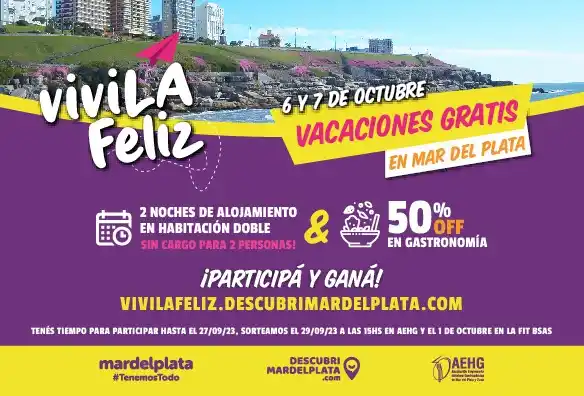 La Asociación Empresaria Hotelera y Gastronómica de Mar del Plata puso en marcha una acción promocional denominada “ViviLa Feliz”, en la que se sortean 200 paquetes de 2 noches de alojamiento en habitación doble para dos personas sin cargo y 50% de descuento en gastronomía en los locales adheridos para ser utilizados de manera exclusiva los días 6 y 7 de octubre.