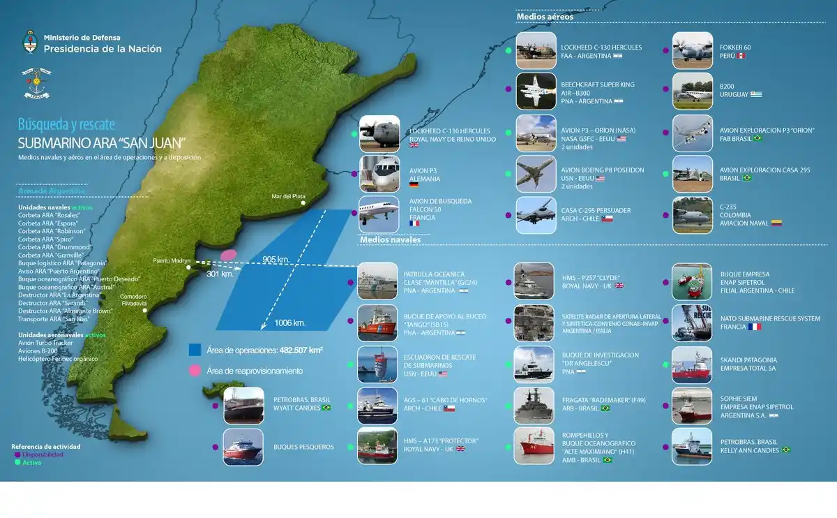 Además otras embarcaciones y aeronaves de países como Colombia, Uruguay y Francia cooperan con la Argentina para encontrar al submarino y a los 44 tripulantes perdidos.