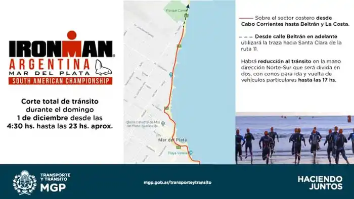 La prueba largará a las 6 del domingo desde Playa Grande, donde los triatletas deberán nadar 3,8 kilómetros. Posteriormente, habrá un recorrido de ciclismo de 180 kilómetros por las calles de General Pueyrredón y del Municipio de Mar Chiquita, para cerrar con 42.195 metros de pedestrismo, pasando por los principales lugares turísticos de la ciudad, con un tiempo máximo para completar el circuito de 17 horas.