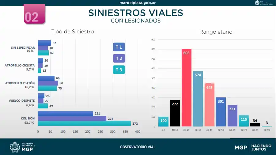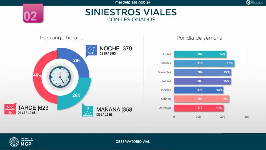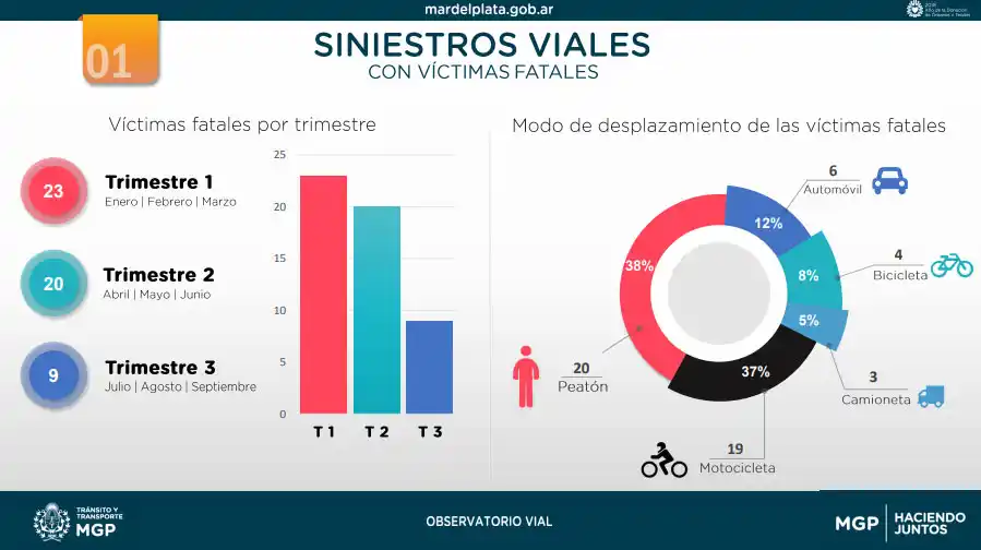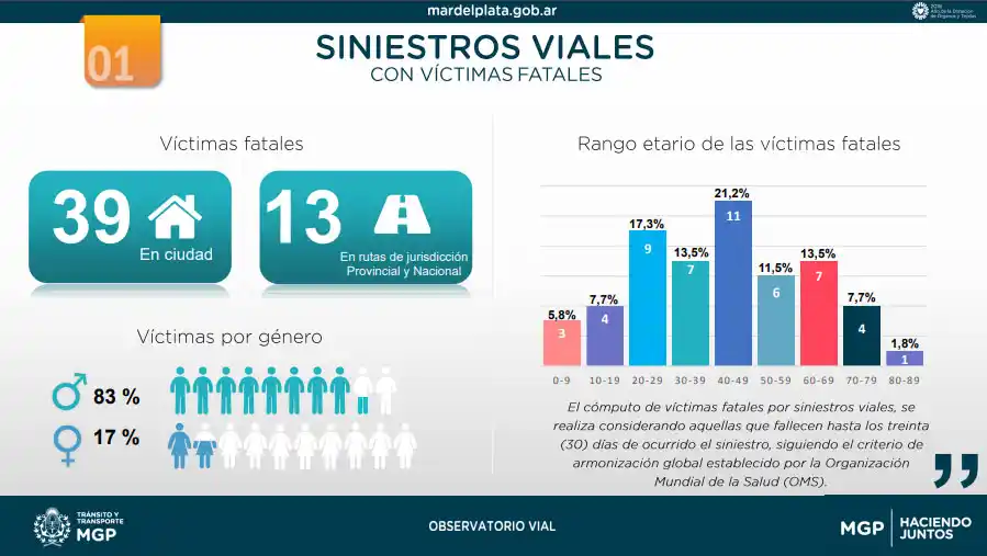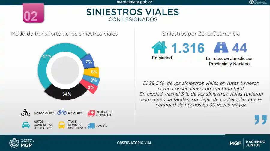 A su vez, los datos relevados por el Observatorio Vial Municipal permitieron concluir que "el 29,5 por ciento de los siniestros viales en rutas tuvieron como consecuencia una víctima fatal, mientras que en la ciudad casi el 3 por ciento de los siniestros viales tuvieron consecuencias fatales, sin dejar de contemplar que la cantidad de hechos es 30 veces mayor".