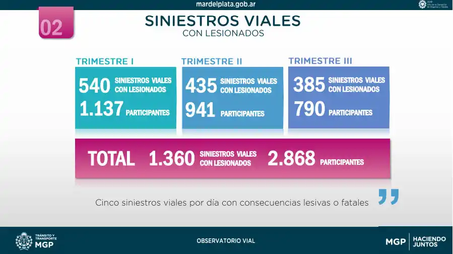 Entre enero y septiembre, hubo 58 muertes y se produjeron un total de 1360 siniestros viales con lesionados, involucrando a 2868 personas, según se detalla en los resultados que se desprenden del relevamiento oficial de la Subsecretaría de Transporte y Tránsito.  Así, se revela que, en promedio, muere una persona cada 5 días por accidentes en la vía pública.