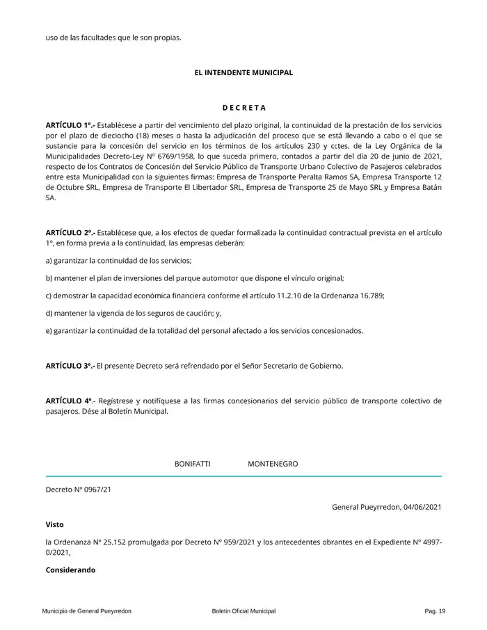 El 4 de junio, en el Boletín Oficial se publicó la prórroga por el servicio de transporte de pasajeros bajo el Decreto N° 966/21 donde en base a lo acordado en el HCD y "promulgando la Ordenanza N° 25.152 por Decreto N° 959/2021 y los antecedentes obrantes en el Expediente Administrativo 4997-0-2021", detalla el escrito.