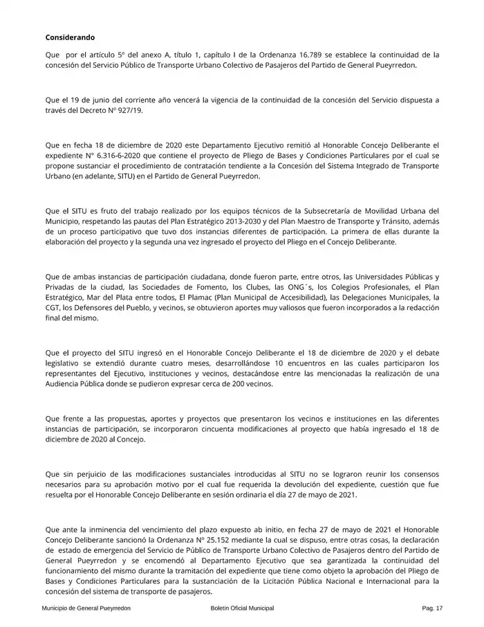 El jefe comunal considero que "ante la inminencia del vencimiento del plazo expuesto ab initio, en fecha 27 de mayo de 2021 el Honorable Concejo Deliberante sancionó la Ordenanza Nº 25.152 mediante la cual se dispuso, entre otras cosas, la declaración de estado de emergencia del Servicio de Público de Transporte Urbano Colectivo de Pasajeros dentro del Partido de General Pueyrredon y se encomendó al Departamento Ejecutivo que sea garantizada la continuidad del funcionamiento del mismo durante la tramitación del expediente que tiene como objeto la aprobación del Pliego de Bases y Condiciones Particulares para la sustanciación de la Licitación Pública Nacional e Internacional para la concesión del sistema de transporte de pasajeros".