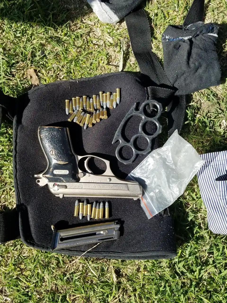 Según informaron fuentes policiales, los sospechosos llevaban en el rodado, modelo VolksWagen Gol, una mochila con una pistola Bersa Calibre 22 largo con un proyectil en recamara, ocho municiones en dicho cargador y una bolsa con 32 proyectiles intactos.