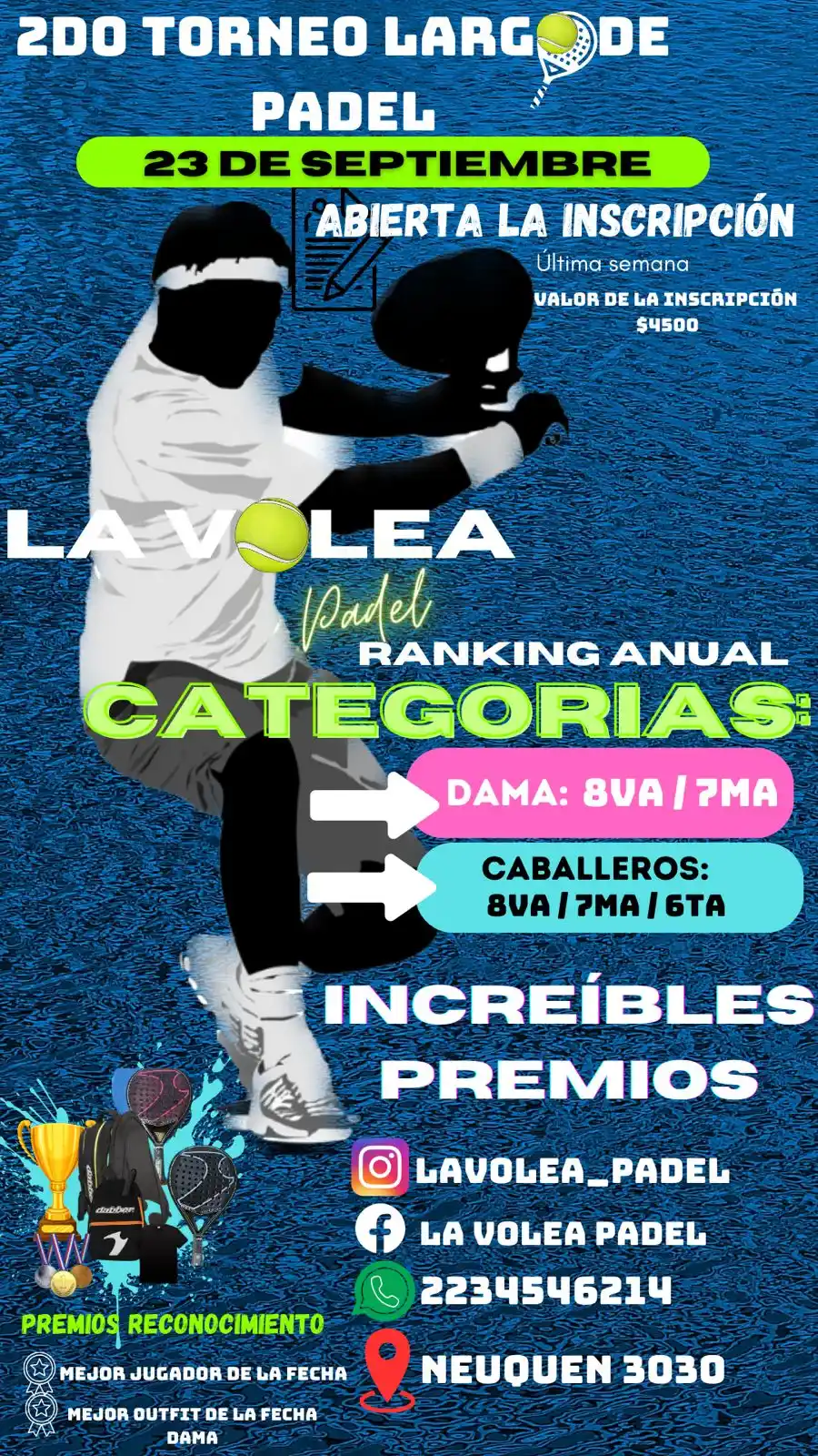 Con increíbles premios, comenzará este sábado 23 de septiembre el segundo torneo largo de pádel de "La Volea", ubicado en la calle Neuquén al 3030. Esta será la última semana para inscribirse, que cuenta con un valor de $4500.