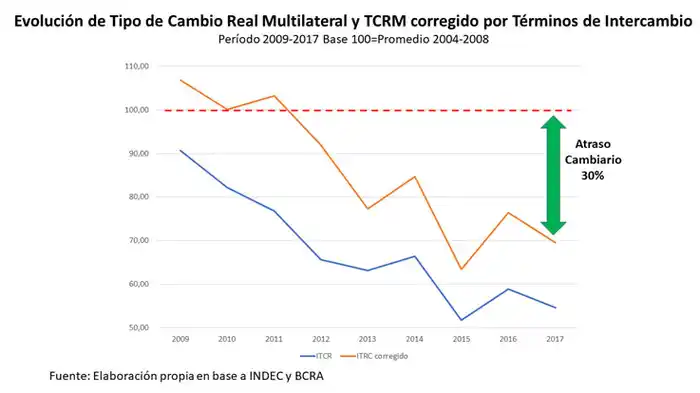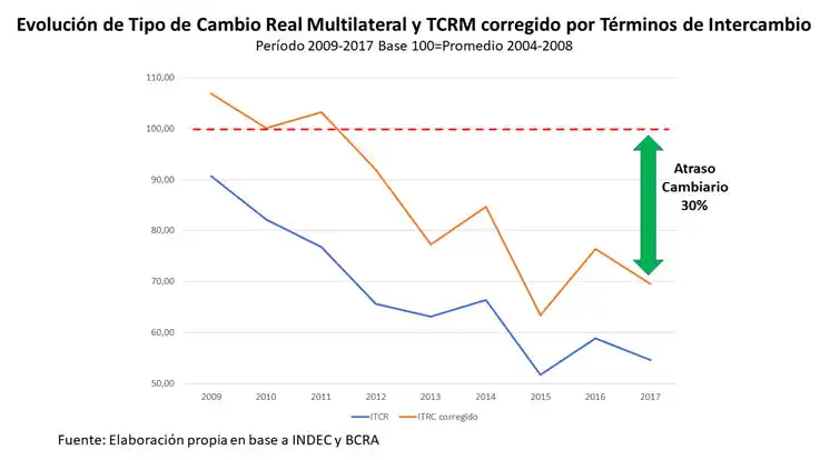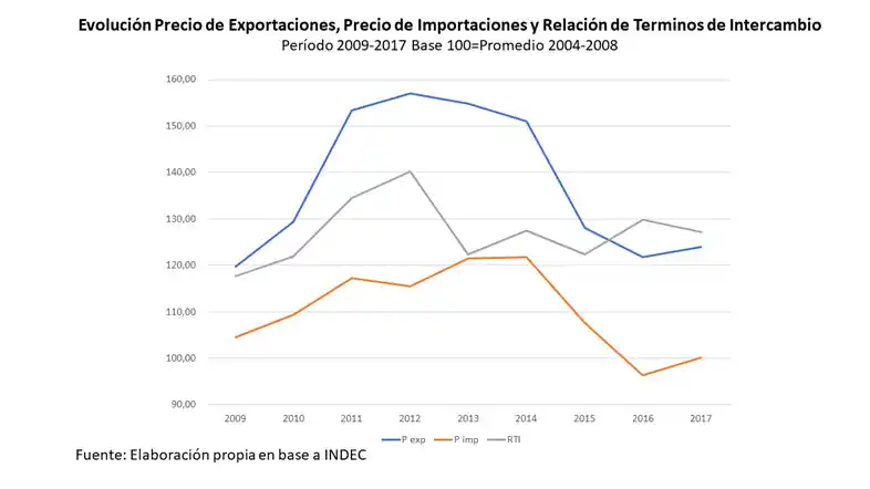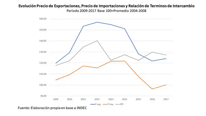 El tipo de cambio real multilateral que estima el Banco Central de abril 2017 muestra una caída del 46% respecto al promedio 2004-2008, lo que claramente indica que a pesar de las devaluaciones efectuadas en 2014 y 2015, la inflación persistente de los últimos años ha apreciado el tipo de cambio real en forma sistemática, por suerte los precios internacionales de nuestras exportaciones crecieron en forma importante, lo que mejoro los términos de intercambio del período en un 27%.