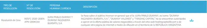 La Comisión Nacional de Valores resolvió intimar a Durany, a “DURANY INGENERÍA BURSÁTIL S.A.”, a “DURANY VALORES” y a “TRADING CAPITAL” al cese inmediato en todo el territorio argentino "de toda invitación u ofrecimiento público de negociación o de cualquier otro acto jurídico con valores negociables dirigido a personas en general o a sectores o grupos determinados, a través del sitio web tradingcapitalib.com o de cualquier otra página de internet o medio de difusión, por no contar con la debida autorización para ello, hasta tanto se adecuen a la normativa vigente".