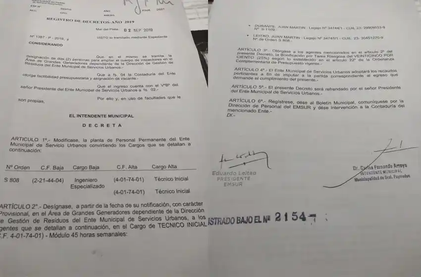 A través del reciente decreto N° 2154, el presidente del Ente Municipal de Servicios Urbanos, Eduardo Leitao nombró a su hijo Juan Martín Leitao en la planta de personal municipal. Desarrollará su tarea en el área de Grandes Generadores en la dirección de Gestión de Residuos del Emsur.