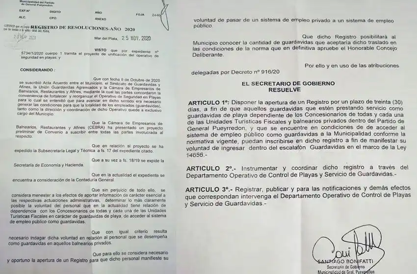 El Sindicato de Guardavidas y Afines y la Unión de Guardavidas Agremiados informaron este jueves que el secretario de Gobierno de General Pueyrredon Santiago Bonifatti procedió a la apertura de un registro para que el personal se presente en forma voluntaria con el objetivo de manifestar su voluntad de pasarse al sistema municipal.