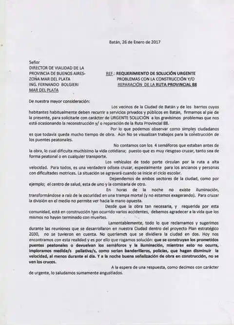 En este marco, firmaron una nota dirigida al director de Vialidad de la provincia de Buenos Aires, Fernando Bolgieri, en la cual remarcan las dificultadas que padece la población para cruzar la ruta, dado que con el inicio de las obras quedaron cuatro semáforos fuera de servicio.