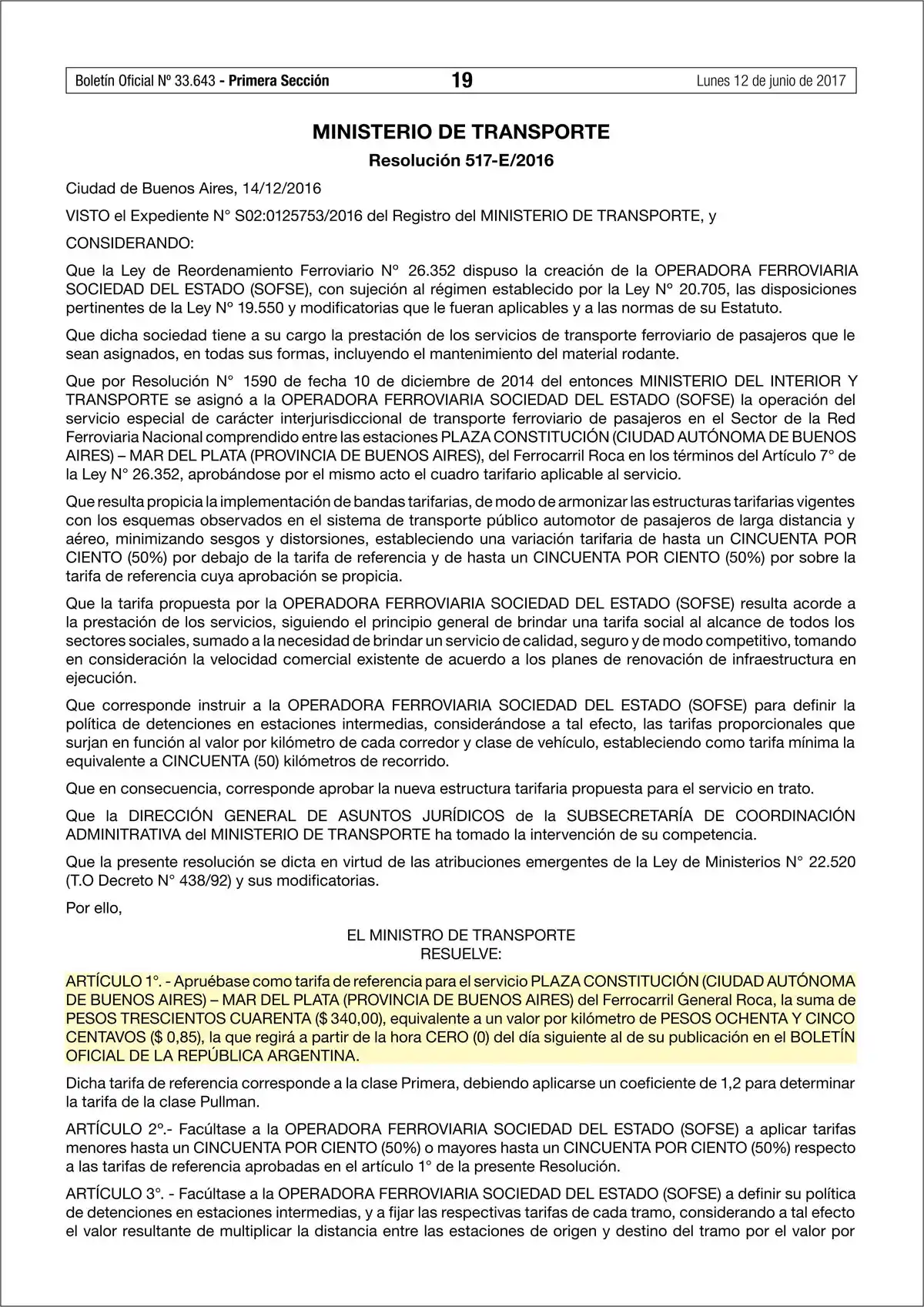 Por medio de la resolución 517-E/2016, que fue publicada este lunes en el Boletín Oficial, desde el Ministerio de Transporte de la Nación se precisó que la nueva tarifa es equivalente a un valor por kilómetro de 0,85 pesos, la cual corresponde a la clase Primera.