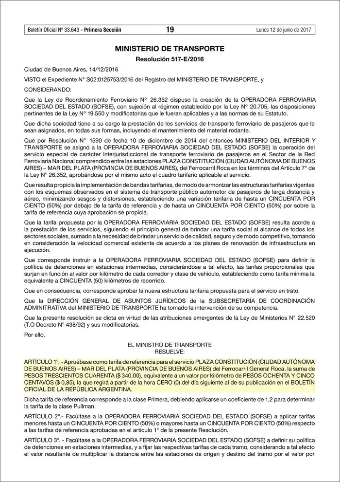En el boletín oficial, el Gobierno explicó que la tarifa propuesta por la Operadora Ferroviaria Sociedad del Estado (SOFSE) "resulta acorde a la prestación de los servicios, siguiendo el principio general de brindar una tarifa social al alcance de todos los sectores sociales, sumado a la necesidad de brindar un servicio de calidad, seguro y de modo competitivo, tomando en consideración la velocidad comercial existente de acuerdo a los planes de renovación de infraestructura en ejecución".