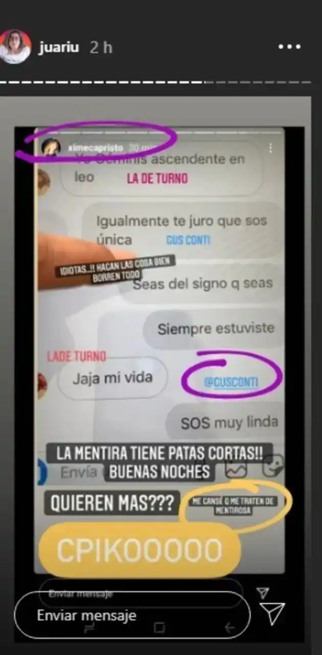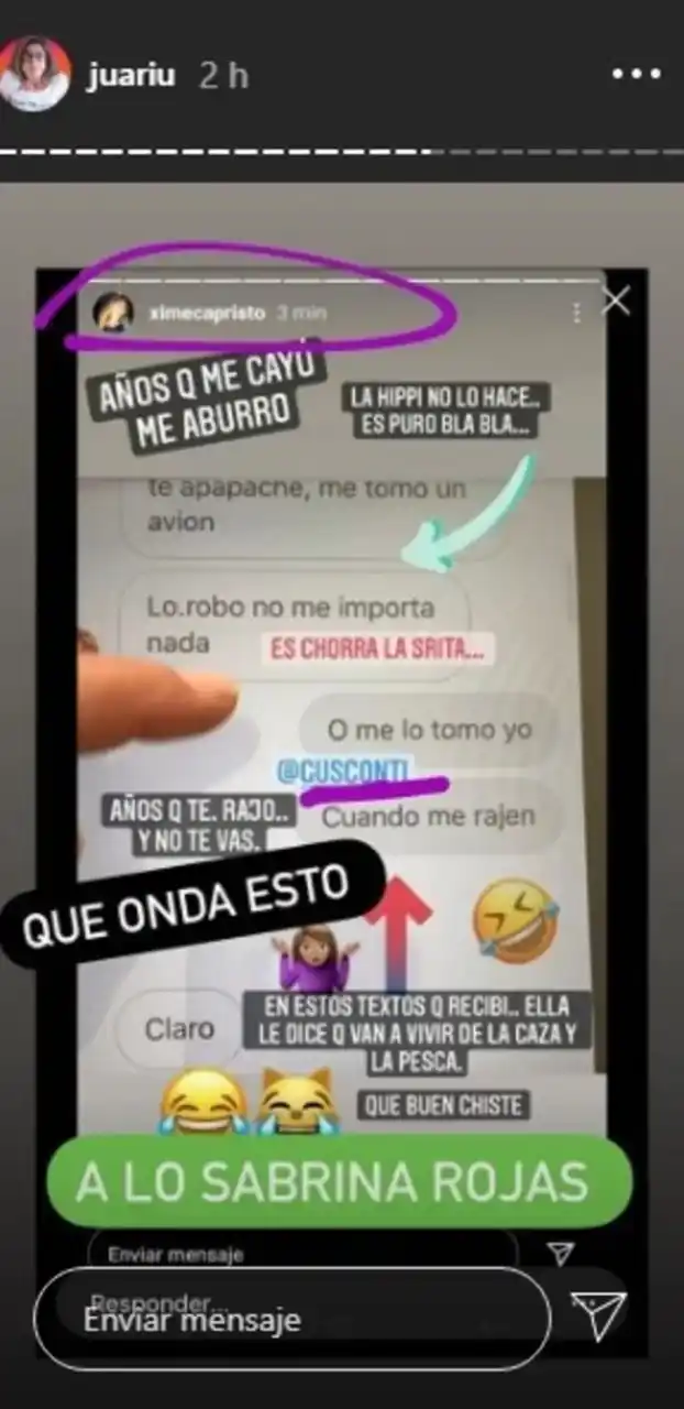 "La hippi (sic) no lo hace... Es puro bla bla.... Es chorrita la señorita", comentó la actriz al lado de esas frases. "O me lo tomo yo cuando me rajen", le responde Conti a la presunta tercera en discordia. "Años que te rajo y no te vas", añadió Ximena.