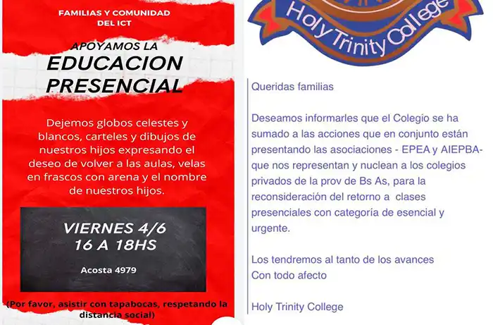 Al momento, ya son seis las instituciones educativas que se manifestaron en este sentido, presentaron, o lo harán próximamente, acciones judiciales en este sentido y anticiparon que realizarán vigilias por la presencialidad, que incluyen velas, globos, carteles y dibujos.