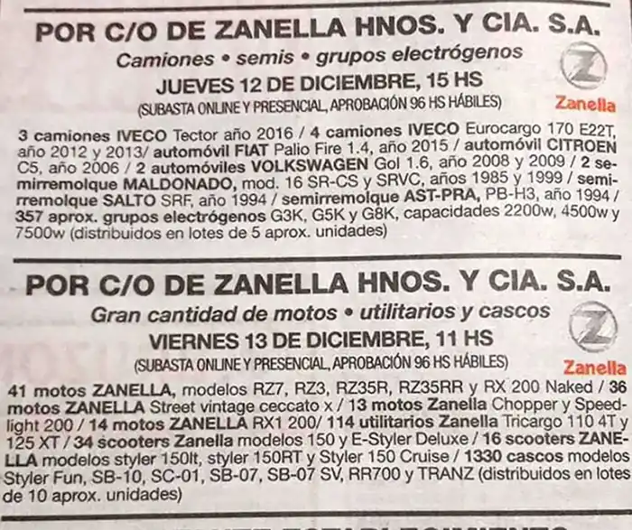 En diarios de la provincia de San Luis se publicaron estos días avisos de remates de bienes de la empresa que van desde 41 motos de la marca Zanella y 1.330 cascos hasta siete camiones marca Iveco, vehículos (Fiat Palio y Citroën C5) y dos semirremolques. También se incluyen grupos electrógenos, scooters y utilitarios.